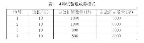 (4)放養模式(shi):至312日(ri)長(zhang)江(jiang)1号扣蟹全部(bu)放齊,520日(ri)南(nan)美白對蝦苗放齊。設(shè)置4種不同放養密度進(jin)行試驗(yàn)研究,詳見表1